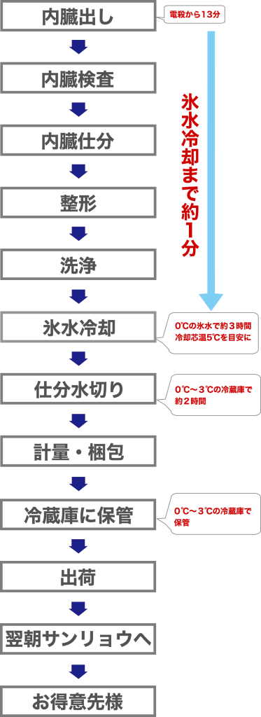豚の内臓処理で重要なのは、鮮度だけではありません。屠畜後の処理にも鮮度を保つ秘訣があります。処理直後の氷水冷却でお客様の元に届くまで、雑菌を増やさずに配送することができます。